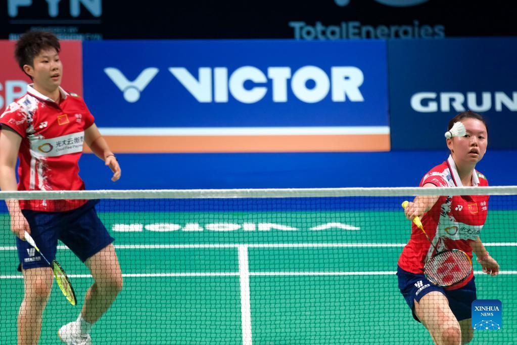 Liu Xuanxuan/Xia Yuting (R) compete during the women's doubles first round match between Liu Xuanxuan/Xia Yuting of China and Rachel Honderich/Kristen Tsai of Canada at the Victor Denmark Open 2021 in Odense, Denmark, Oct. 20, 2021. (Xinhua/Zhang Cheng)
