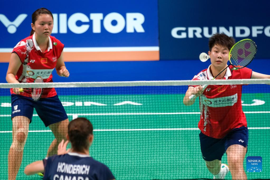 Liu Xuanxuan (R)/Xia Yuting compete during the women's doubles first round match between Liu Xuanxuan/Xia Yuting of China and Rachel Honderich/Kristen Tsai of Canada at the Victor Denmark Open 2021 in Odense, Denmark, Oct. 20, 2021. (Xinhua/Zhang Cheng)