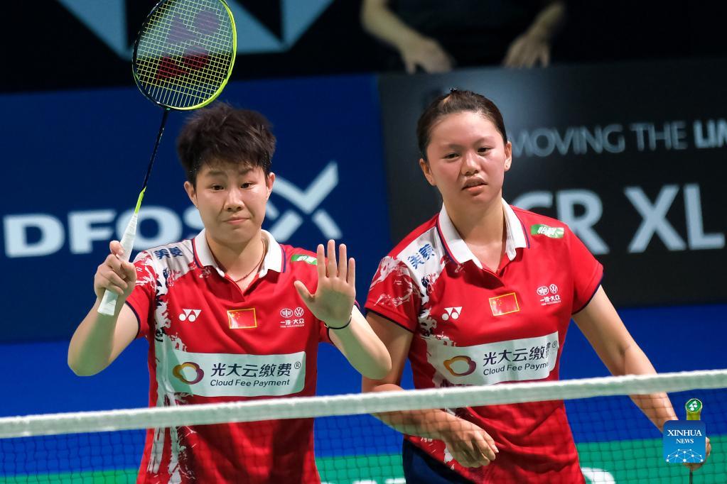 Liu Xuanxuan (L)/Xia Yuting react during the women's doubles first round match between Liu Xuanxuan/Xia Yuting of China and Rachel Honderich/Kristen Tsai of Canada at the Victor Denmark Open 2021 in Odense, Denmark, Oct. 20, 2021. (Xinhua/Zhang Cheng)