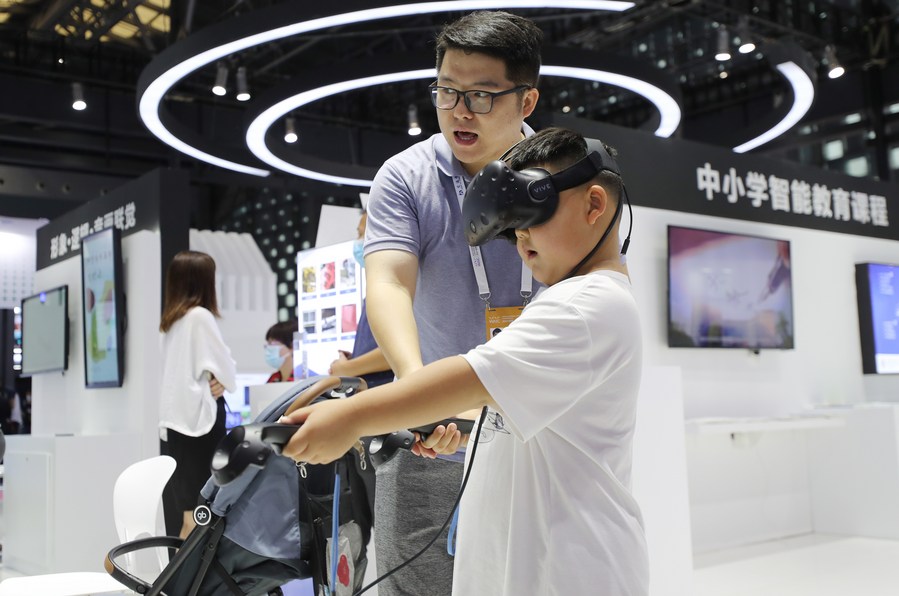 A boy tries a VR device at the 2021 World Artificial Intelligence Conference (WAIC) in east China's Shanghai, July 8, 2021. (Xinhua/Fang Zhe)