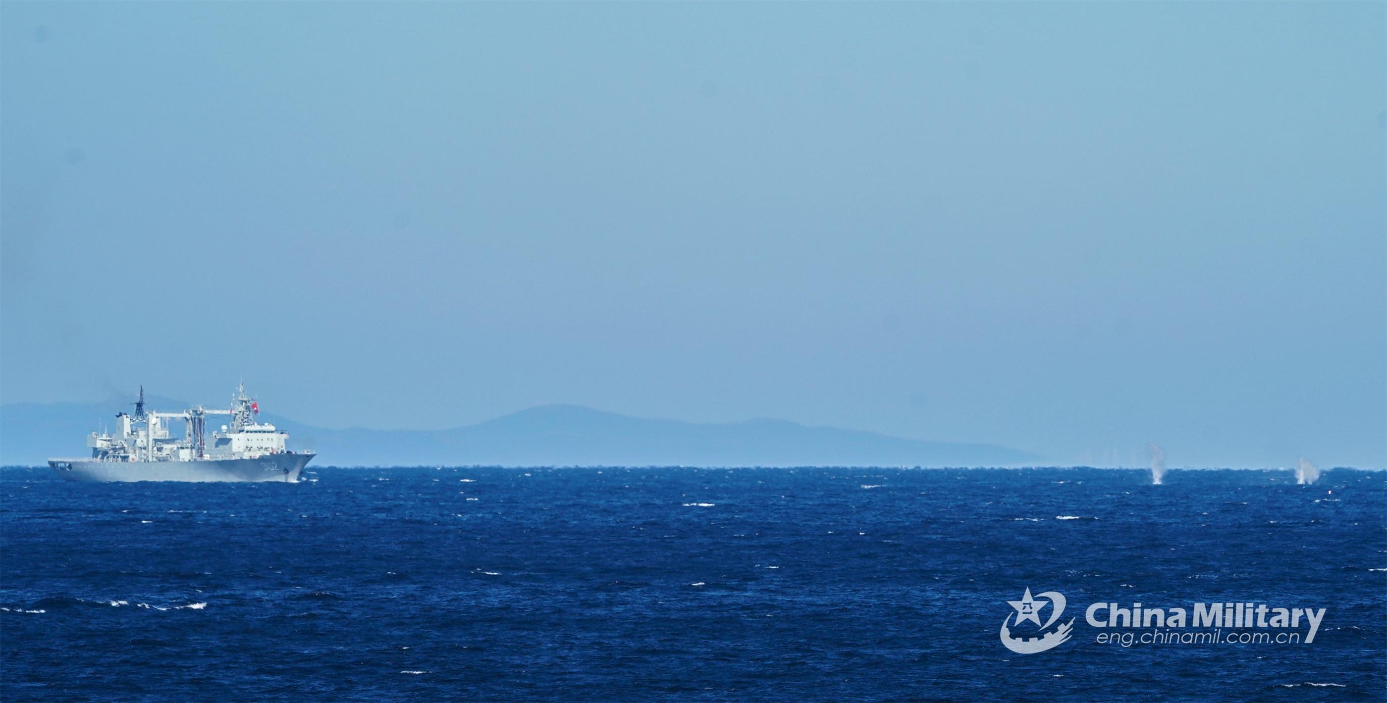 The Chinese naval comprehensive supply ship Dongpinghu (Hull 902) fires at floating mines during the China-Russia joint naval exercise Joint Sea-2021on Oct. 15, 2021. Being a normal arrangement made by the two navies according to the annual plan, the Joint Sea-2021 exercise kicked off on October 14 in waters near Russia's Peter the Great Bay. (eng.chinamil.com.cn/Photo by Sun Jingang)