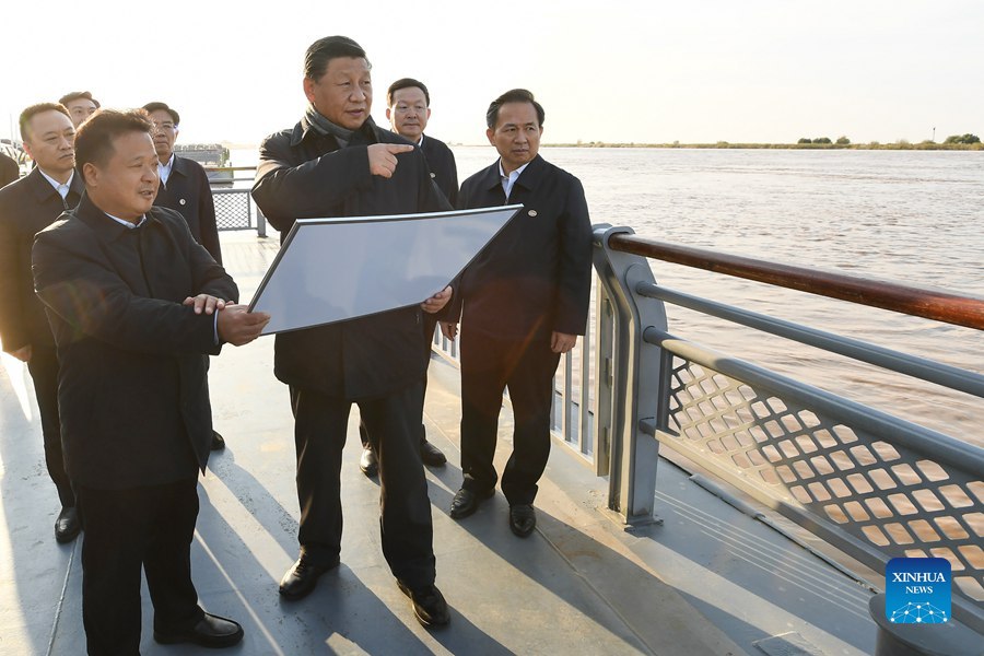 Chinese President Xi Jinping, also general secretary of the Communist Party of China Central Committee and chairman of the Central Military Commission, checks the Yellow River's waterways and learns about the ecological protection and high-quality development of the Yellow River basin at a dock as he inspects the estuary of the Yellow River in the city of Dongying, east China's Shandong Province, Oct. 20, 2021. (Xinhua/Xie Huanchi)