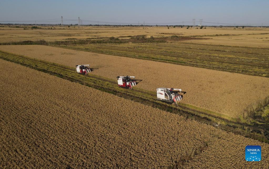 Aerial photo taken on Oct. 21, 2021 shows farmers operating harvesters on a rice field in Wangtan Town of Tangshan, north China's Hebei Province. (Xinhua/Zhu Xudong)