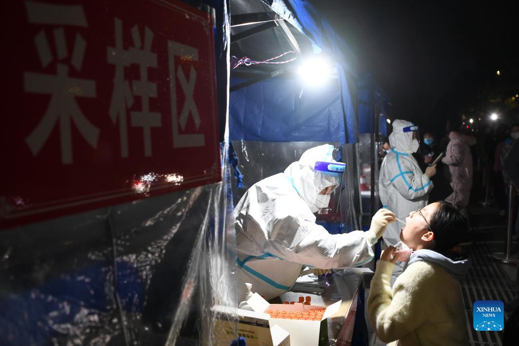 Medical workers collect swab samples at a nucleic acid testing site in Chengguan District of Lanzhou City, northwest China's Gansu Province, Oct. 21, 2021. As of 8 p.m. Wednesday, Lanzhou has registered a total of eight locally transmitted confirmed COVID-19 cases and one asymptomatic case since new local infections were reported. Local authorities set up hundreds of nucleic acid testing sites to provide 24-hour testing services for the residents. (Xinhua/Fan Peishen)
