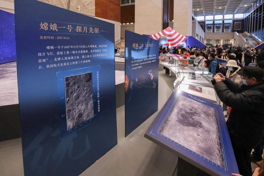 Visitors watch exhibits about China’s Chang’e-1 and Chang’e-2 lunar missions at the National Museum of China in Beijing, Feb. 28, 2021. (People’s Daily Online/Chen Xiaogen)