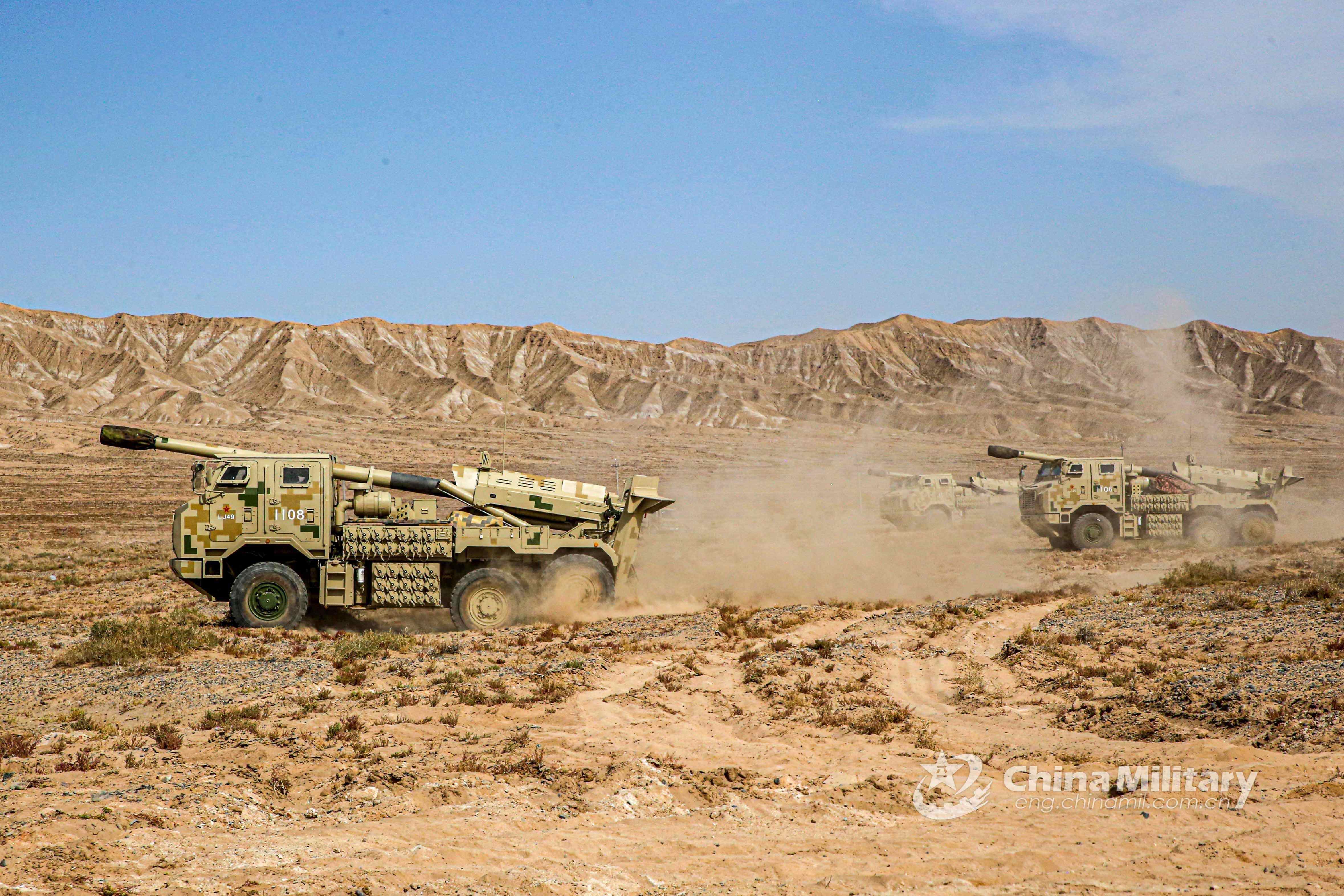 The vehicle-mounted howitzers attached to an artillery element under the PLA Xinjiang Military Command stand ready to conduct the tactical training on October 11, 2021. (eng.chinamil.com.cn/Photo by Chen Ming)