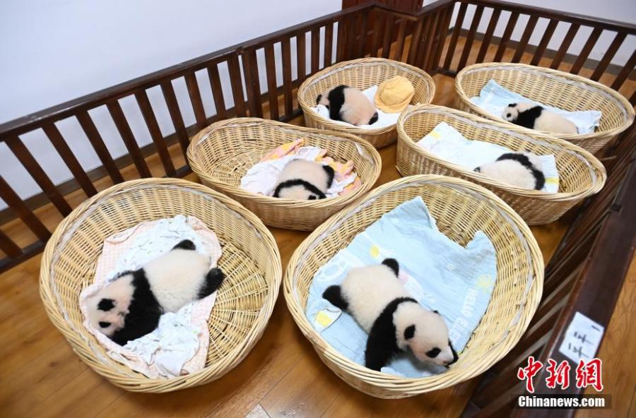 Six giant panda cubs rest in baskets at Shenshuping base of China Conservation and Research Center for the Giant Panda, Wolong National Nature Reserve, Sichuan Province, Oct. 20, 2021. (Photo: China News Service/An Yuan)