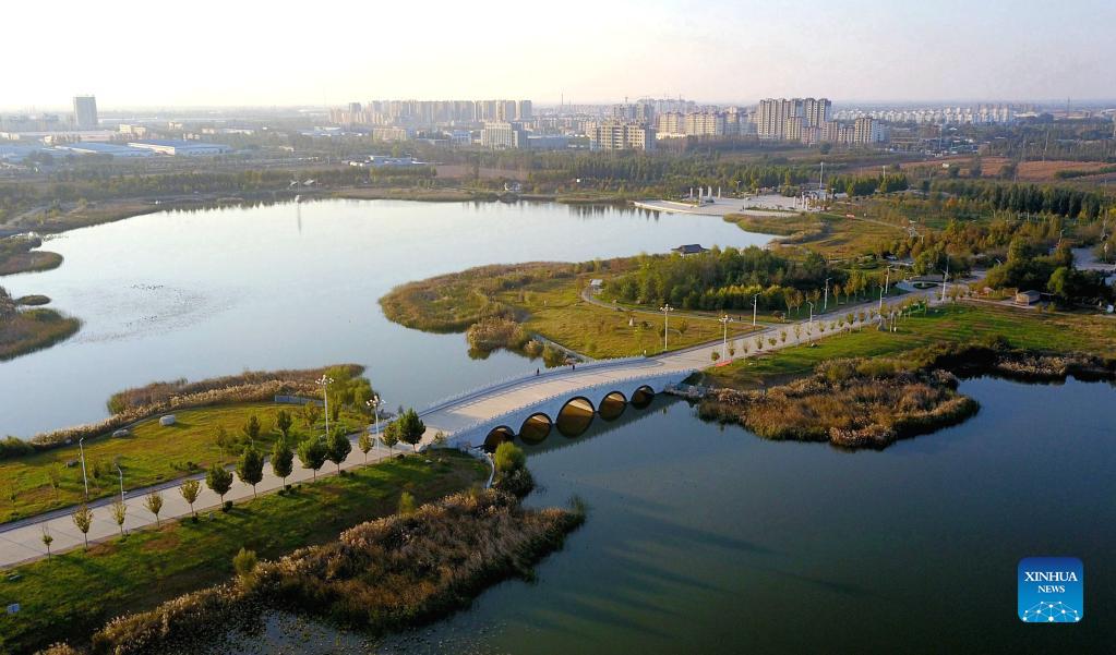 Aerial photo taken on Oct. 21, 2021 shows Nanhu Park of Xinhe County in north China's Hebei Province. Xinhe County boosts rural vitalization by developing distinctive agricultural products, improving living environment and elevating governance capability. (Xinhua/Wang Xiao)