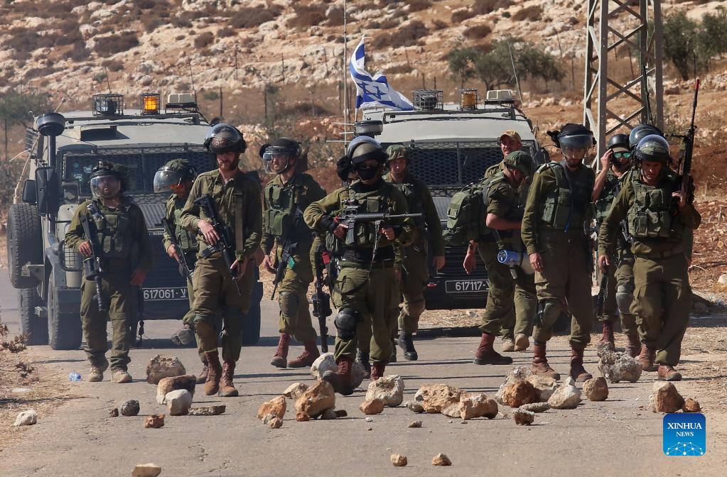 Israeli soldiers hold their weapons during clashes with Palestinian protesters during a protest against the expansion of Jewish settlements in the West Bank village of Beit Dajan, east of Nablus, on Oct. 22, 2021. (Photo by Nidal Eshtayeh/Xinhua)
