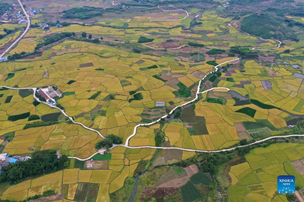 Aerial photo taken on Oct. 23, 2021 shows the countryside scenery at Xingui Village of Rongan County, south China's Guangxi Zhuang Autonomous Region. (Xinhua/Huang Xiaobang)