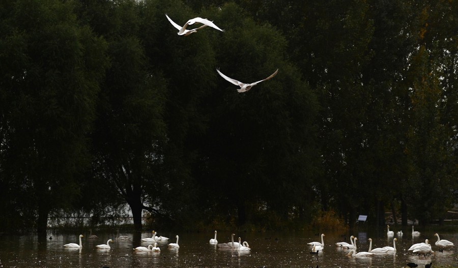 Swans rest on a lake near the Yellow River in Pinglu, north China's Shanxi Province, Oct. 27, 2020. (Xinhua/Ma Yimin)