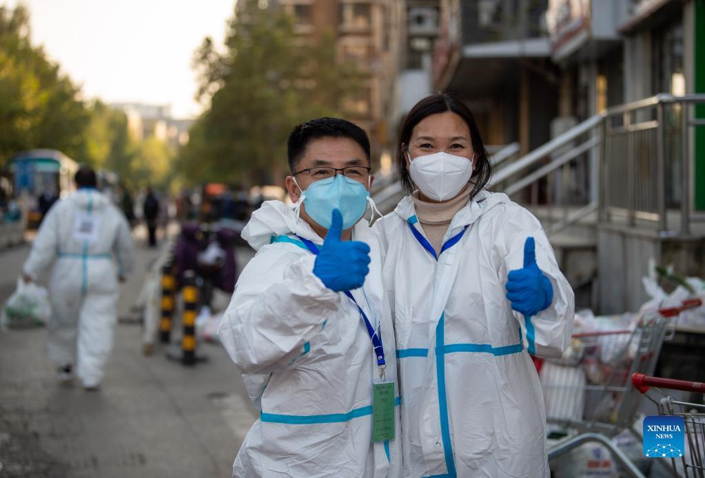Resident Meng Xue (L) and his wife Li Yan volunteer in COVID-19 prevention and control services at the Hongfuyuan residential community in Changping District of Beijing, capital of China, Oct. 23, 2021. The Hongfuyuan residential community was listed as high risk of COVID-19 on Saturday and has been put under closed-off management. (Xinhua/Chen Zhonghao)