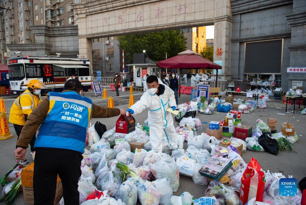 A deliveryman hands over customer's goods to an epidemic prevention and control staff at the Hongfuyuan residential community in Changping District of Beijing, capital of China, Oct. 23, 2021. The Hongfuyuan residential community was listed as high risk of COVID-19 on Saturday and has been put under closed-off management. (Xinhua/Chen Zhonghao)