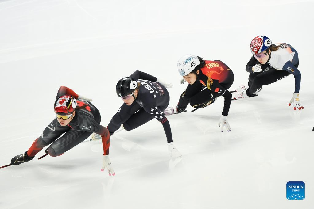 Courtney Sarault (1st L) of Canada and Kristen Santos (2nd L) of the United States compete during the women's 1500m final at ISU World Cup Short Track 2021/2022 in Beijing, capital of China, on Oct. 23, 2021. (Xinhua/Ju Huanzong)