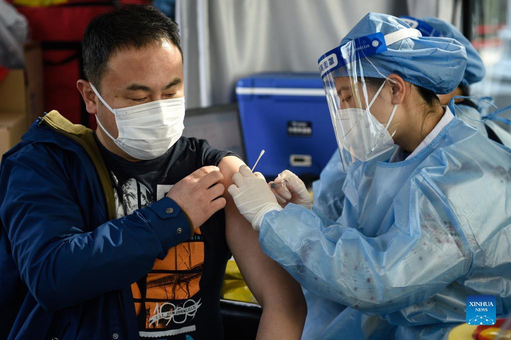A medical worker administers a booster shot of the COVID-19 vaccine to a resident at a vaccination site in Daxing District of Beijing, capital of China, Oct. 23, 2021. Yizhuang of Daxing District began to offer a booster shot of the COVID-19 vaccine from Thursday. (Xinhua/Peng Ziyang)