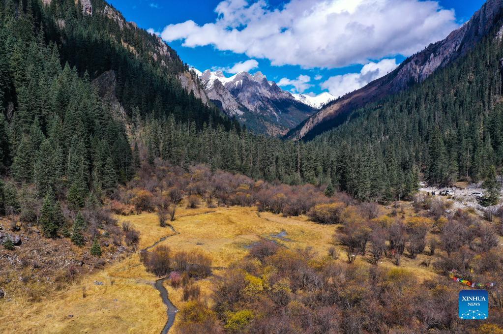 Aerial photo taken on Oct. 23, 2021 shows the scenery of Babagou scenic spot in Baiyu County, Ganzi Tibetan Autonomous Prefecture, southwest China's Sichuan Province. (Xinhua/Wang Xi)