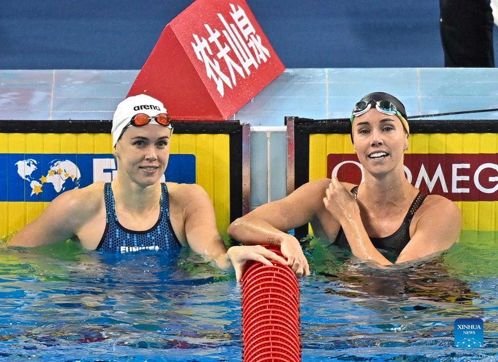 Emma Mckeon (R) of Australia reacts after winning the women's 100m butterfly final at FINA Swimming World Cup 2021 in Doha, capital of Qatar, Oct. 23, 2021. (Photo by Nikku/Xinhua)
