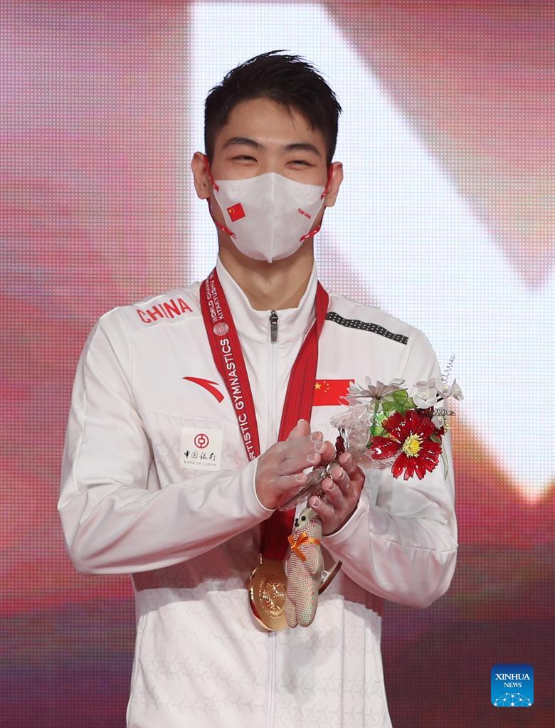 Hu Xuwei of China attends the awarding ceremony of the men's horizontal bar final at the 50th FIG Artistic Gymnastics World Championships in Kitakyushu, Japan, Oct. 24, 2021. (Xinhua/Du Xiaoyi)