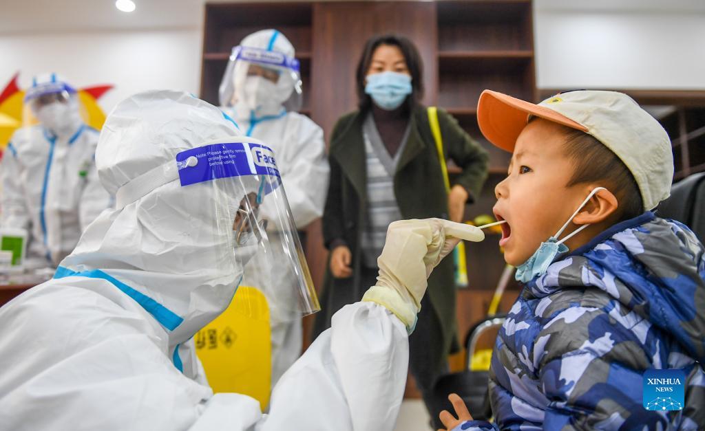 A medical worker collects a swab sample from a child at a temporary nucleic acid testing site in Hohhot, north China's Inner Mongolia Autonomous Region, Oct. 24, 2021. To curb the spread of COVID-19, the city of Hohhot has launched nucleic acid testing for residents from key regions and all people entering and leaving Hohhot by air, train, shuttle bus, taxi, private cars and other means of transportation. (Xinhua/Peng Yuan)