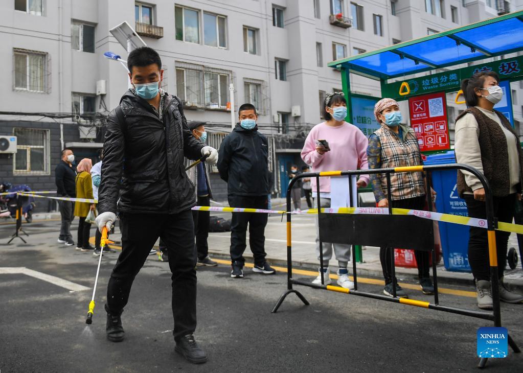 A staff member sprays disinfectant at a temporary nucleic acid testing site in Hohhot, north China's Inner Mongolia Autonomous Region, Oct. 24, 2021. To curb the spread of COVID-19, the city of Hohhot has launched nucleic acid testing for residents from key regions and all people entering and leaving Hohhot by air, train, shuttle bus, taxi, private cars and other means of transportation. (Xinhua/Peng Yuan)