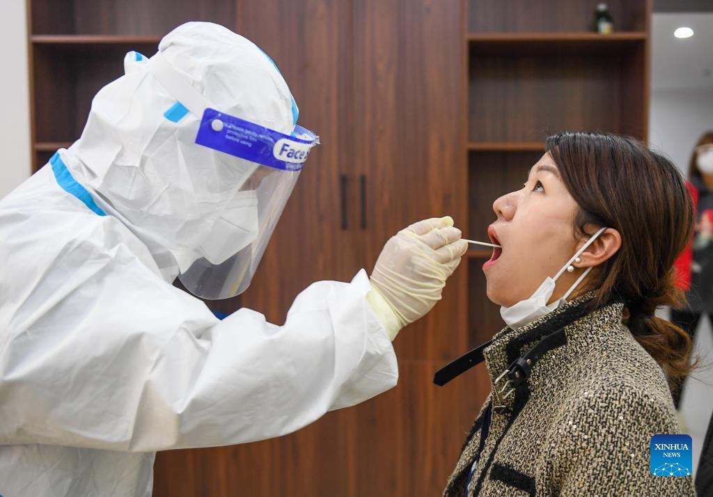 A medical worker collects a swab sample from a resident at a temporary nucleic acid testing site in Hohhot, north China's Inner Mongolia Autonomous Region, Oct. 24, 2021. To curb the spread of COVID-19, the city of Hohhot has launched nucleic acid testing for residents from key regions and all people entering and leaving Hohhot by air, train, shuttle bus, taxi, private cars and other means of transportation. (Xinhua/Peng Yuan)