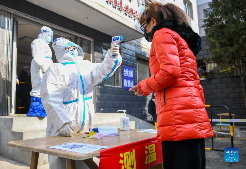 A resident has her temperature measured at a temporary nucleic acid testing site in Hohhot, north China's Inner Mongolia Autonomous Region, Oct. 24, 2021. To curb the spread of COVID-19, the city of Hohhot has launched nucleic acid testing for residents from key regions and all people entering and leaving Hohhot by air, train, shuttle bus, taxi, private cars and other means of transportation. (Xinhua/Peng Yuan)