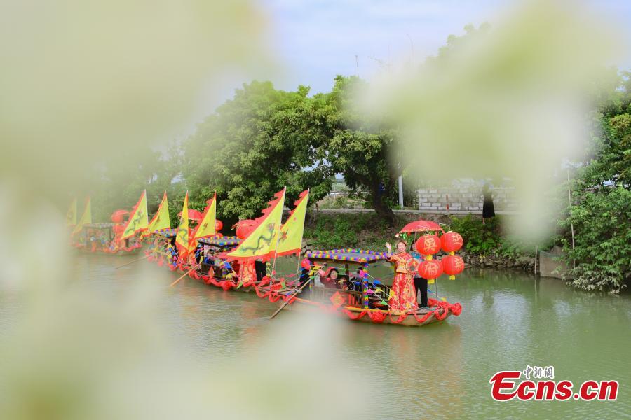 Boats decorated with floral ornaments carrying a bride sail on a river in Nan'ao Village, Doumen District, Zhuhai, south China's Guangdong Province, Oct. 24, 2021. (Photo: China News Service/Chen Jimin)