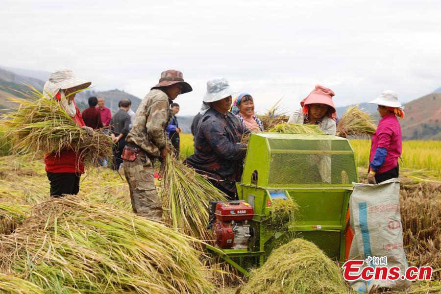 Local villagers put newly harvested rice into a machine for preliminary sieving in Nansa Village, Hani, Yi and Dai Autonomous County, Yuxi City, Yunnan Province, Oct. 24, 2021. (Photo: China News Service/Li Jiaxian)