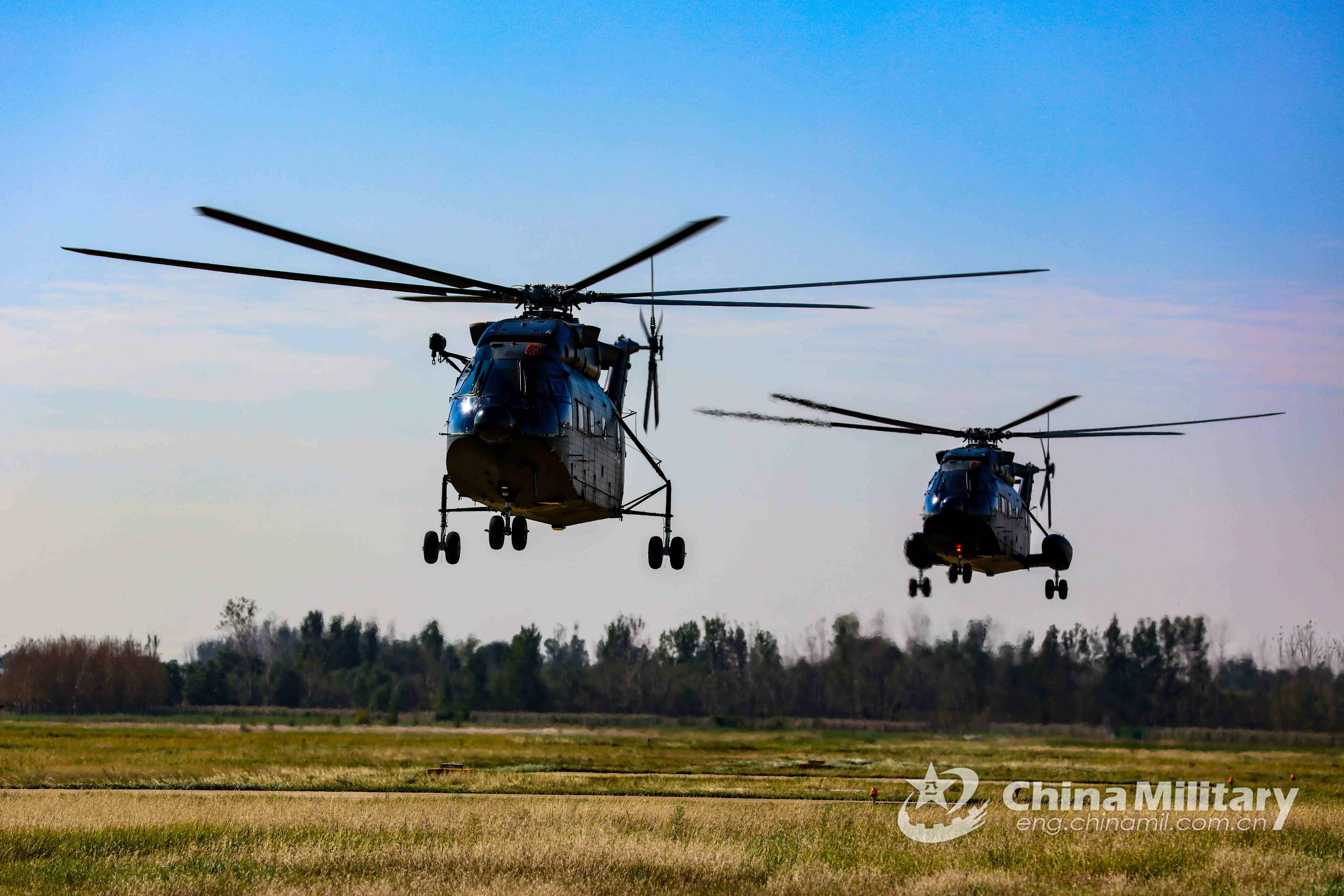 Two helicopters attached to an army aviation brigade under the PLA 80th Group Army hover above the grassland during a flight training exercise aiming to hone the troops' combat capabilities on October 12, 2021. (eng.chinamil.com.cn/Photo by Li Peng)