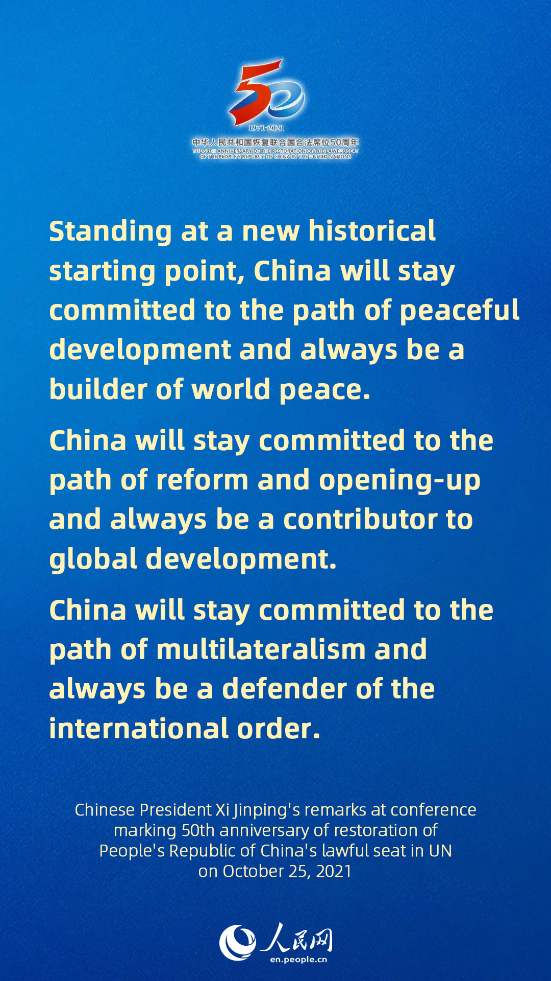 - Full text of Chinese President Xi Jinping's remarks at conference marking 50th anniversary of restoration of People's Republic of China's lawful seat in UN