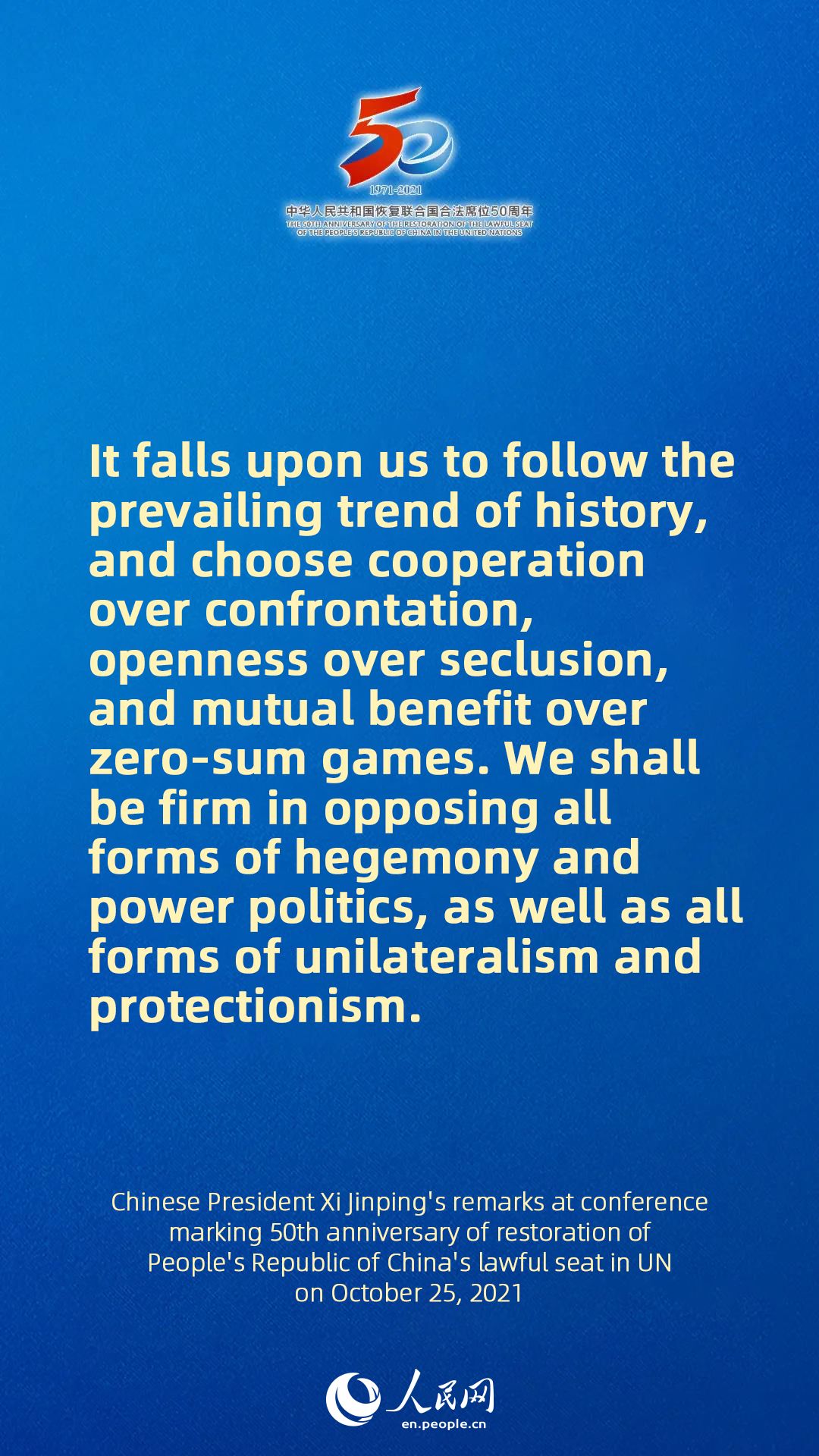 - Full text of Chinese President Xi Jinping's remarks at conference marking 50th anniversary of restoration of People's Republic of China's lawful seat in UN