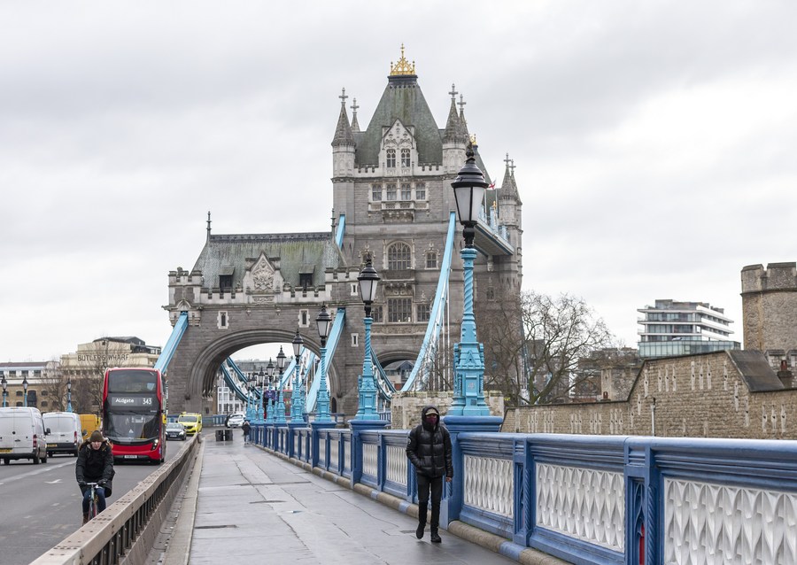 Vehicles and pedestrians are seen on the Tower Bridge in London, Britain, on Jan. 5, 2021. (Xinhua/Han Yan)