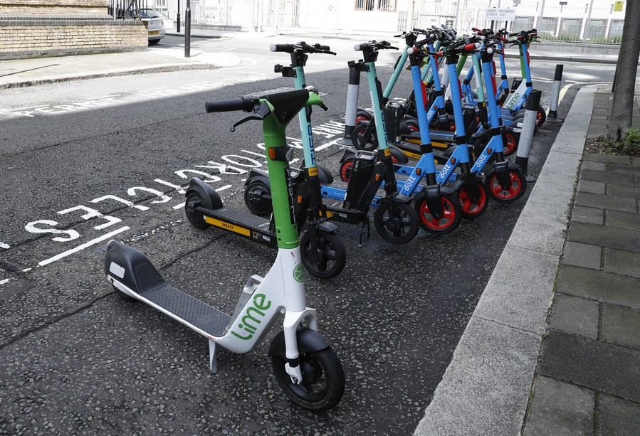 An E-scooter hire spot is pictured on the street in London, Britain, Aug. 9, 2021. (Xinhua/Han Yan)