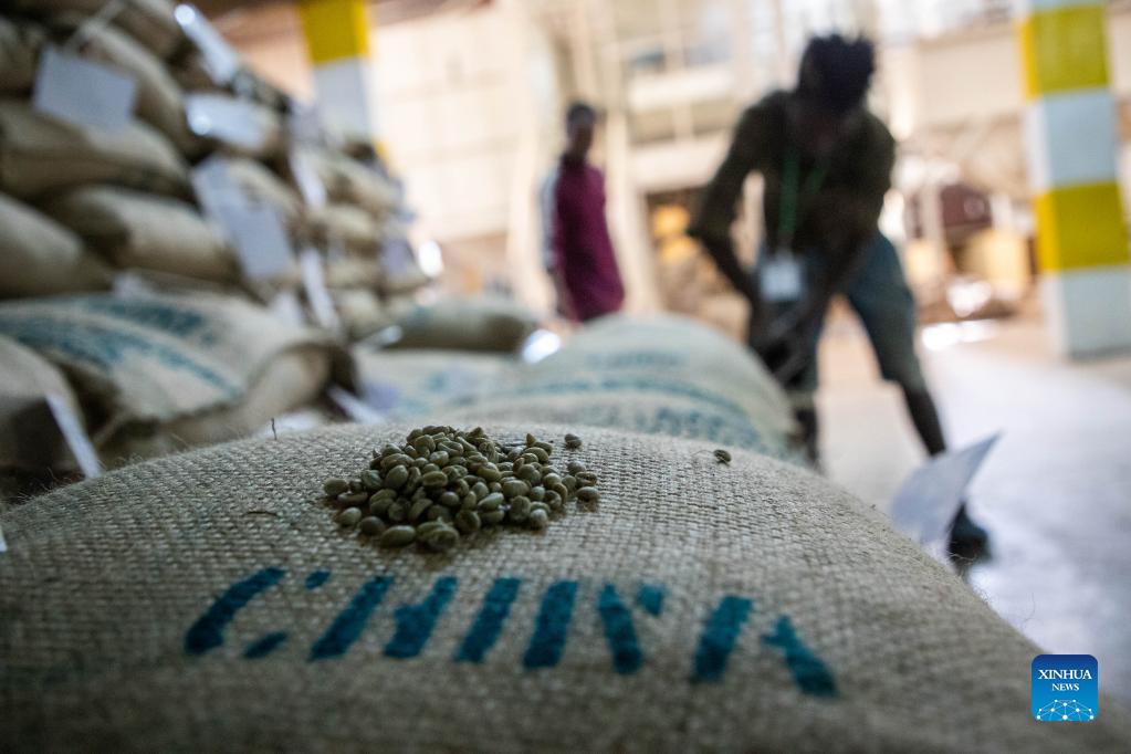Photo taken on Oct. 21, 2021 shows bags of coffee beans to be exported to China at a warehouse of Kerchanshe Trading Private Limited Company (PLC) in Addis Ababa, Ethiopia. Kerchanshe Trading Private Limited Company (PLC), the largest producer and exporter of coffee in Ethiopia, says the upcoming 4th China International Import Expo (CIIE) will create a huge opportunity for coffee-producing and exporting companies. (Xinhua/Michael Tewelde)