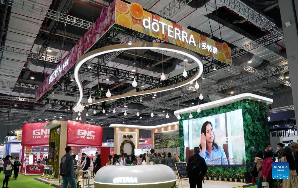 Photo taken on Nov. 8, 2020 shows a view of the booth of essential oil brand doTERRA at the 3rd China International Import Expo (CIIE) in east China's Shanghai. The U.S. essential oil brand doTERRA, a three time participant in the China International Import Expo (CIIE) since 2018, is growing rapidly in China market after its appearance in the CIIE as its launch pad. Boasting a workforce of more than 200 employees, doTERRA is running a factory, a laboratory, and a flagship shop in Shanghai, and its products have attracted a good number of loyal consumers across the country. (Xinhua/Liu Ying)