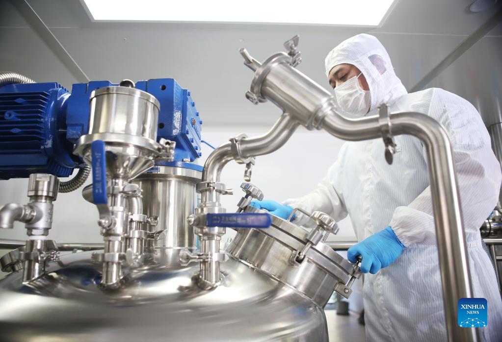 A staff member operates at a factory of essential oil brand doTERRA in east China's Shanghai, April 28, 2020. The U.S. essential oil brand doTERRA, a three time participant in the China International Import Expo (CIIE) since 2018, is growing rapidly in China market after its appearance in the CIIE as its launch pad. Boasting a workforce of more than 200 employees, doTERRA is running a factory, a laboratory, and a flagship shop in Shanghai, and its products have attracted a good number of loyal consumers across the country. (Xinhua)