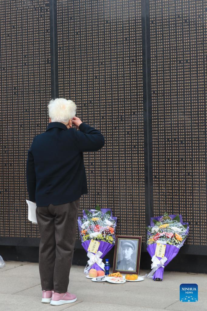 Li Man mourns for his brother Li Zhengming, who died during the 1950-53 Korean War, at the Chinese People's Volunteers (CPV) martyrs' cemetery in Shenyang, northeast China's Liaoning Province, Oct. 25, 2021. A commemoration ceremony was held on Monday in memory of the 71th anniversary of the Chinese People's Volunteers (CPV) army entering the Democratic People's Republic of Korea (DPRK) in the War to Resist U.S. Aggression and Aid Korea. Representatives of CPV veterans and family members of CPV martyrs attended the ceremony. (Xinhua/Yang Qing)