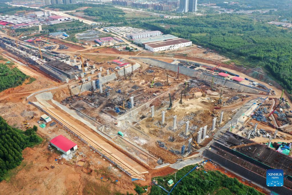Aerial photo taken on Oct. 25, 2021 show the construction site of Nanningbei Railway Station in Nanning, south China's Guangxi Zhuang Autonomous Region. Construction is in full swing at the railway station as part of the Guiyang-Nanning high-speed railway project. With a length of 482 km, the railway line will cut travel time from Nanning to Guiyang from over 10 hours to 2 and a half hours. (Xinhua/Lu Boan)