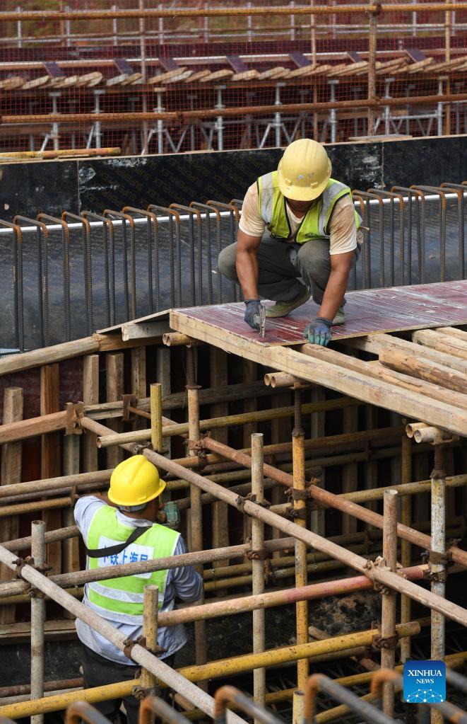 Workers are seen at the construction site of Nanningbei Railway Station in Nanning, south China's Guangxi Zhuang Autonomous Region, Oct. 25, 2021. Construction is in full swing at the railway station as part of the Guiyang-Nanning high-speed railway project. With a length of 482 km, the railway line will cut travel time from Nanning to Guiyang from over 10 hours to 2 and a half hours. (Xinhua/Lu Boan)