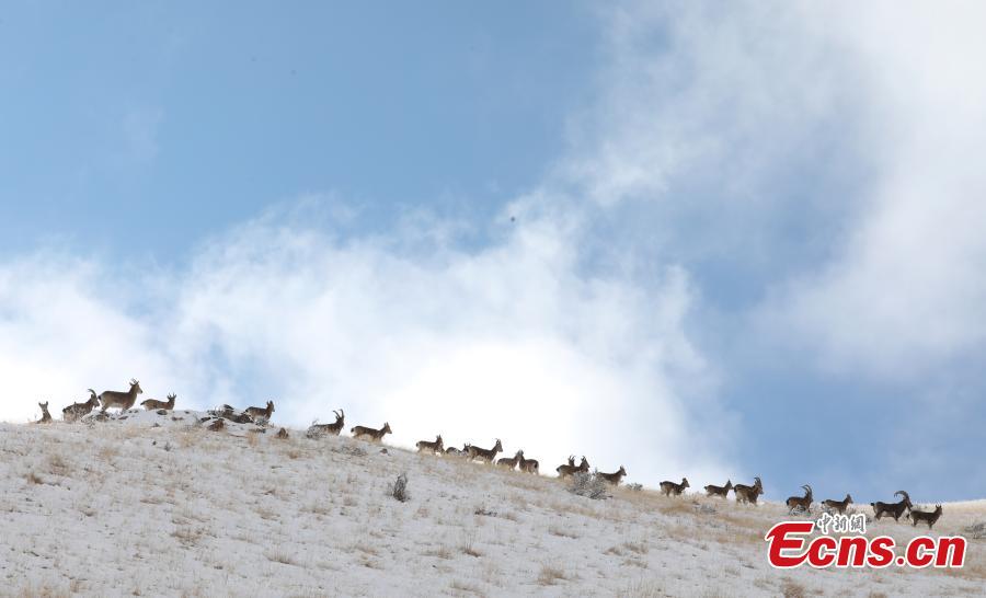 Flocks of Siberian ibex play in the snow in Bozhou, northwest China's Xinjiang Uygur Autonomous Region, Oct. 23, 2021. (Photo: China News Service/Shen Zhijun)