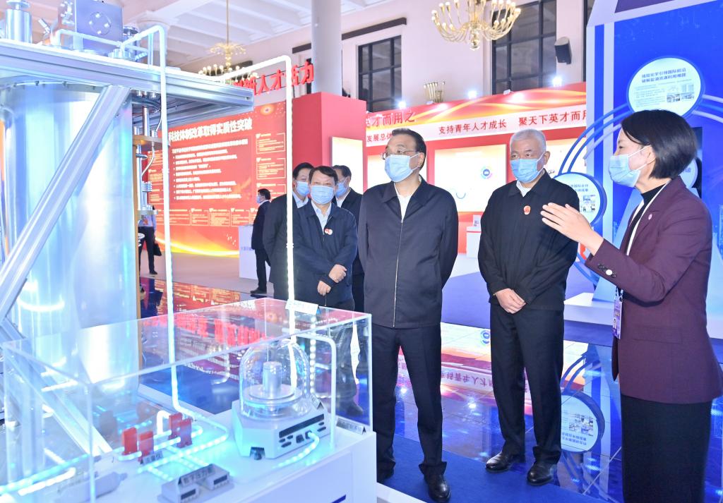 Chinese Premier Li Keqiang, also a member of the Standing Committee of the Political Bureau of the Communist Party of China Central Committee, visits an exhibition of China's achievements in scientific and technological innovation during the 13th Five-Year Plan period (2016-2020) in Beijing, capital of China, Oct. 26, 2021. (Xinhua/Yue Yuewei)