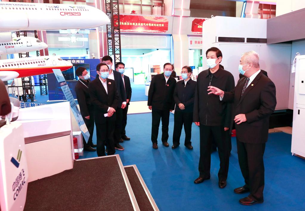 Li Zhanshu, a member of the Standing Committee of the Political Bureau of the Communist Party of China Central Committee and chairman of the National People's Congress Standing Committee, visits an exhibition of China's achievements in scientific and technological innovation during the 13th Five-Year Plan period (2016-2020) in Beijing, capital of China, Oct. 26, 2021. (Xinhua/Pang Xinglei)