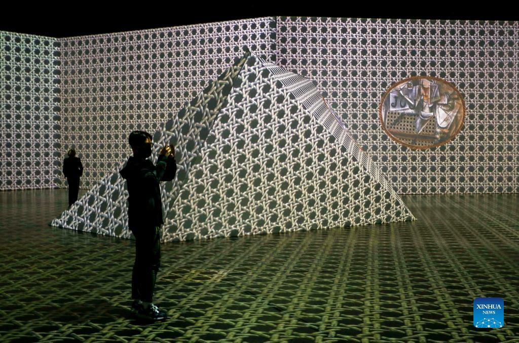 People attend a preview of the Imagine Picasso immersive exhibition in Vancouver, British Columbia, on Oct. 26, 2021. Unleashed from frames to inhabit the space in a continuous flow, more than 200 of Picasso's works are projected at the Imagine Picasso immersive exhibition, which will run in Vancouver from Oct. 27, 2021 until Jan. 8. 2022. (Photo by Liang Sen/Xinhua)