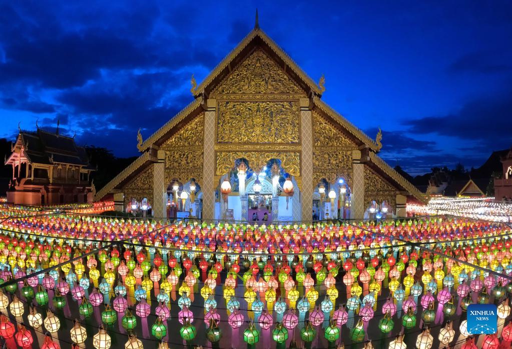 Colorful lanterns are seen at the Wat Phra That Hariphunchai in Lamphun, Thailand, Oct. 25, 2021. Lamphun Province of Thailand held a grand lantern festival at the Wat Phra That Hariphunchai, attracting tourists to hang lanterns and make wishes. (Xinhua/Wang Teng)