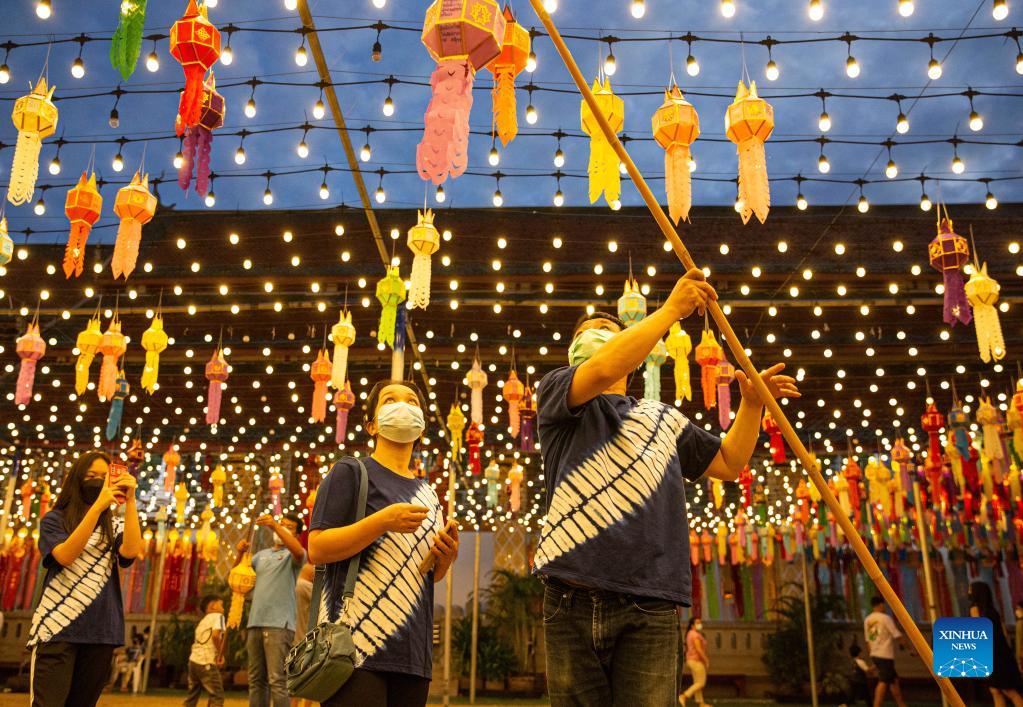 A tourist hangs a lantern at the Wat Phra That Hariphunchai in Lamphun, Thailand, Oct. 25, 2021. Lamphun Province of Thailand held a grand lantern festival at the Wat Phra That Hariphunchai, attracting tourists to hang lanterns and make wishes. (Xinhua/Wang Teng)