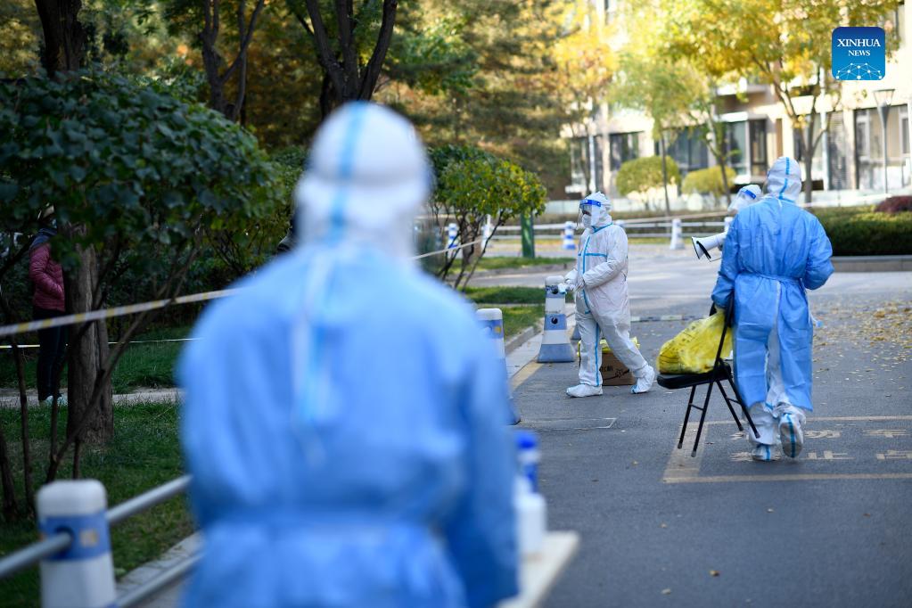 Staff members prepare to conduct nucleic acid testing for residents at a residential compound locked down due to COVID-19 resurgence in Jinfeng District, Yinchuan, northwest China's Ningxia Hui Autonomous Region, Oct. 24, 2021. (Xinhua/Wang Peng)
