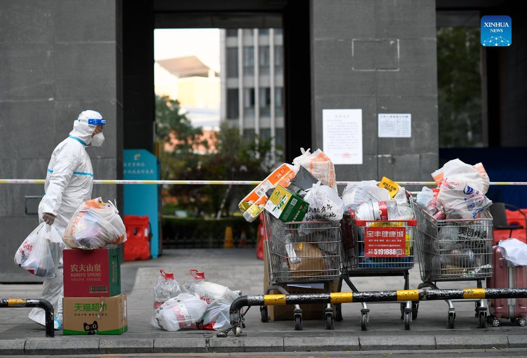 A staff member delivers daily life supplies for residents at a residential compound locked down due to COVID-19 resurgence in Jinfeng District, Yinchuan, northwest China's Ningxia Hui Autonomous Region, Oct. 24, 2021. (Xinhua/Wang Peng)