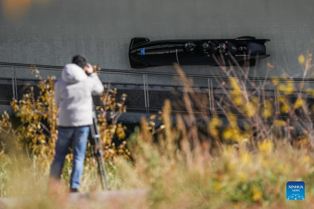 Austria's Benjamin Maier, Nick Kompain, Sascha Stepan and Kristian Huber compete for a 4-man heat of Bobsleigh during a test event for Beijing 2022 Olympic Winter Games at the National Sliding Center in Yanqing Zone, Beijing, capital of China, Oct. 26, 2021. (Xinhua/Peng Ziyang)