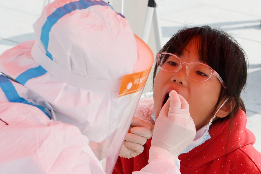 A child receives a nucleic acid test at a testing site in Chengguan District of Lanzhou, northwest China's Gansu Province, Oct. 24, 2021. (Xinhua/Fan Peishen)