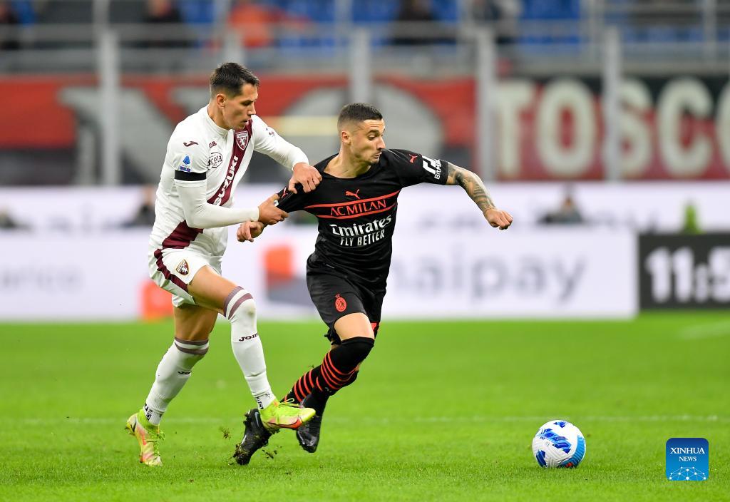 AC Milan's Rade Krunic (R) vies with Torino's Sasa Lukic during a Serie A football match between AC Milan and Torino in Milan, Italy, on Oct. 26, 2021. (Str/Xinhua)
